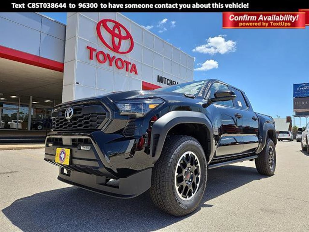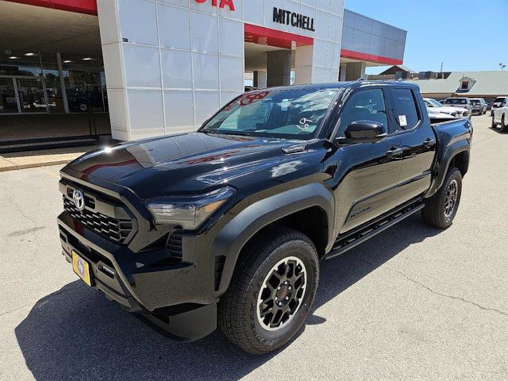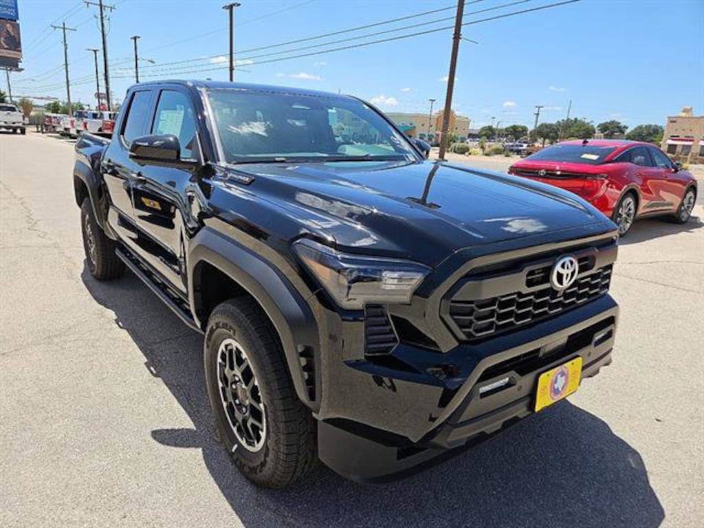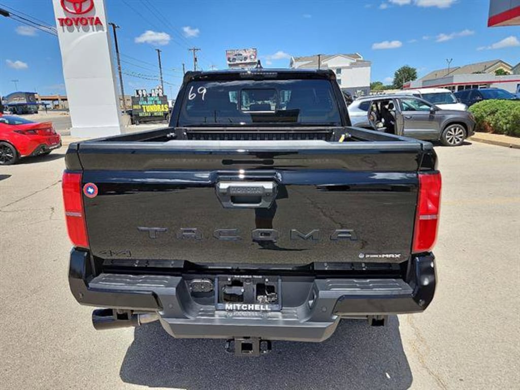 50 State Emissions, Bed Scene Lighting adds additional lighting around your Tacoma truck bed with four strategically placed lights for enhanced illumination for the dark driveway to the dimly lit trail. . Designed to provide ample light coverage around your truck bed, it makes it easier to load/unload cargo, set up camp, or perform tasks in low-light conditions . Built to withstand the rigors of off-road adventures, these lights are durable and perform in most environments, Finish off the Tacoma's bold style with this chrome or dark chrome exhaust tip. . Constructed of polished, corrosion-resistant, single-walled 304 stainless steel . Easy bolt-on installation; no cutting, drilling or welding, Get the spray-on bedliner that's as tough and durable as your Tacoma. Protect your bed from damage with this permanently bonded fixture. . New, Toyota-exclusive softer material to keep items from sliding in the bed . Toyota quality standards assure uniform thickness and a consistent texture . Textured surface is designed to prevent cargo from sliding . No lost cargo space, minimal added weight . Proprietary application method helps create a straight and crisp edge . Fully warranted; repairs completed quickly and easily at a Toyota dealership, Rock Rails, Towing Technology Package - Includes Towing Hitch,Integrated Trailer Brake Controller, TRD Off-Road Premium Package (i-FORCE MAX) - includes SofTex(R)-trimmed seats with heated and ventilated power-adjustable front seats, leather-trimmed heated steering wheel, 14-in. Toyota Audio Multimedia display, Multi-Terrain Monitor (MTM), JBL(R) Premium Audio with JBL(R) FLEX portable speaker, moonroof, Qi-compatible wireless charging, dual zone automatic climate control, digital rearview mirror with HomeLink(R) universal transceiver, Integrated Trailer Brake Controller (ITBC), power open/close tailgate, and power horizontal rear window - Includes 3D Multi-Terrain Monitor,Front camera: Front mounted camera,Right camera: Right side camera,Left camera: Left side camera,Rear camera: Rear mounted camera,Camera: Aerial view camera,Ground view camera: Multi-Terrain Monitor (MTM) ground view camera,Power Tilt/slide Moonroof with Sliding Sunshade,TACOMA Stamped Power Open and Close Tailgate,Auto-Dimming Digital Display Rearview Mirror,Pedestrian Detection,Pedestrian detection: Pre-Collision System with Pedestrian Detection,Rear pedestrian detection: Rear pedestrian detection warning,Heated and Ventilated Front Seats,Heated front seats: Heated driver and front passenger seats,Cooled front seats: Ventilated driver and front passenger seats,Heated Leather-Trimmed Steering Wheel,Steering wheel material: Leather steering wheel,Heated steering wheel,Qi-Compatible Wireless Charging,14" Toyota Audio Multimedia,JBL Premium Audio,Speakers: JBL speakers,Amplifier,Digital signal processor,Wireless speaker number: 1 wireless speaker,Speakers number: 9 speakers,Satellite trial: 3 month satellite trial subscription,Primary display size: 14 inch primary display,Primary display touchscreen: Primary monitor touchscreen,Smart device integration: Apple CarPlay/Android Auto smart device wireless mirroring,USB ports: 3 USB ports,Radio: AM/FM/digital/SiriusXMsatellite,Power Horizontal Rear Window,Dual Zone Automatic Climate Control,Climate control: Automatic climate control,Air conditioning: Yes,Dual-zone front climate control,Front and Rear Parking Assist with Automatic Braking,Digital Key Capability,Keyfob keyless entry: Remote Connect Digital Key (1-year trial subscription) keyfob keyless entry,Fob engine controls: Smart Key with hands-free access and push button start,Smart device-as-key proximity door locks: Remote Connect Digital Key (3 year trial) smart device-as-key proximity door locks,Pre-Wired Auxiliary Switches,AC Power Inverter,SofTex Seat Trim,Front seat upholstery: SofTex leatherette front seat upholstery,Front seatback upholstery: SofTex leatherette front seatback upholstery,Rear seat upholstery: SofTex leatherette rear seat upholstery,8-Way Power Driver and Passenger Seat Adjusters,Driver seat direction: Driver seat with 8-way directional controls,Passenger seat direction: Front passenger seat with 8-way directional controls,Power driver seat controls: Driver seat power reclining, cushion tilt, fore/aft control and height adjustable control,Power passenger seat controls: Passenger seat power reclining, cushion tilt, fore/aft control and height adjustable control,Towing hitch: Trailer hitch,Towing brake controller: Trailer brake controller,Vehicle and trailer reverse assist: Vehicle and trailer reverse assist with visual graphic guidance only,Manual driver seat controls: Driver seat manual lumbar support