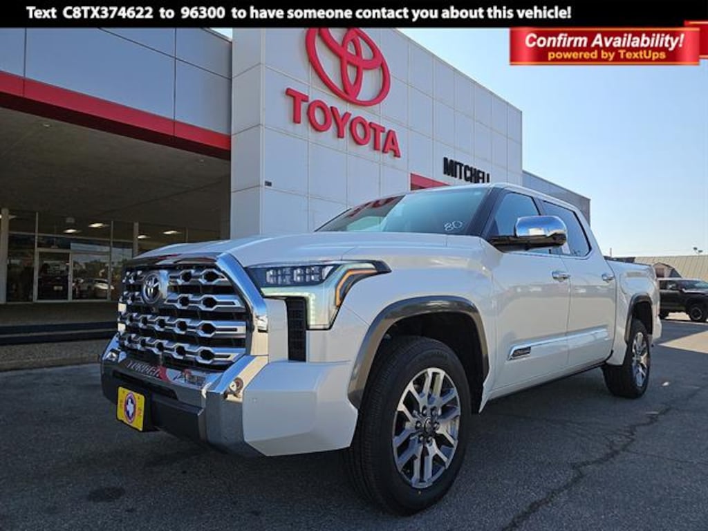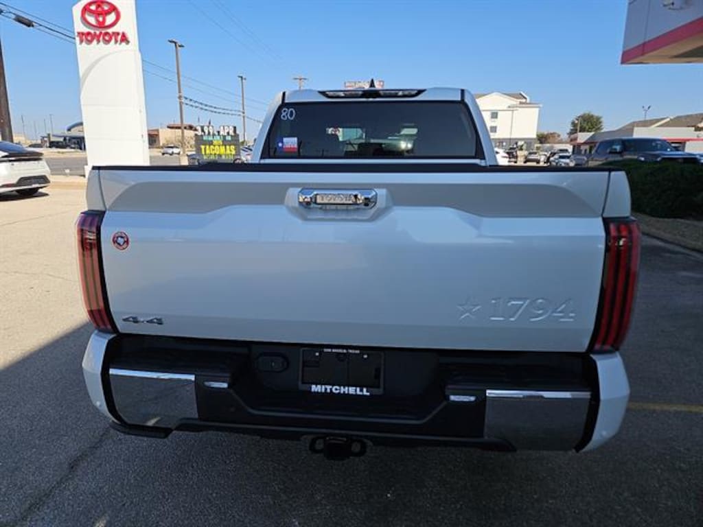 10-in. color Head-Up Display, 1794 Grade Package - All Content Included as Standard Equipment - Includes Chrome Exhaust Tail Pipe & Diffuser, 50 State Emissions - Includes Emissions: LEV3-ULEV70 emissions,Emissions tiers: Tier 3 Bin 70 emissions, Get the spray-on bedliner that's as tough and durable as your Tundra. Protect your bed from damage with this permanently bonded fixture. . New, Toyota-exclusive softer material to keep items from sliding in the bed . Toyota quality standards assure uniform thickness and a consistent texture . Textured surface is designed to prevent cargo from sliding . No lost cargo space, minimal added weight . Features a Tundra logo . Proprietary application method helps create a straight and crisp edge . Fully warranted; repairs completed quickly and easily at a Toyota dealership - Includes Bed liner: Spray-in pickup bed liner,Front seat upholstery: Leather front seat upholstery,Rear seat upholstery: Leather rear seat upholstery, Power running boards and power bed step, Precisely machined and weight-balanced to help secure your wheels and tires against theft. . Resistant to lock-removal tools and secured by a single unique key . Available in Chrome or Black PVD, PVM + BSM Outer Mirrors - Includes Multi-Terrain Back Monitor,Front camera: Front mounted camera,Right camera: Right side camera,Left camera: Left side camera,Rear camera: Rear mounted camera,Camera: Panoramic View Monitor aerial view camera,Ground view camera: Multi-Terrain Monitor (MTM) ground view camera,Pickup box camera,Blind spot: Blind Spot Monitor (BSM),Door mirror style: Chrome door mirrors